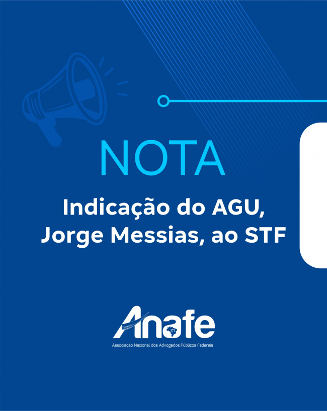 A Associação Nacional dos Advogados Públicos Federais (ANAFE) saúda a indicação do Advogado-Geral da União, Jorge Rodrigo Araújo Messias, para compor o Supremo Tribunal Federal (STF), anunciada nesta data pelo Presidente da República. A trajetória do indicado na Advocacia Pública — com atuação na Procuradoria-Geral do Banco Central, Procuradoria da Fazenda Nacional e na chefia…