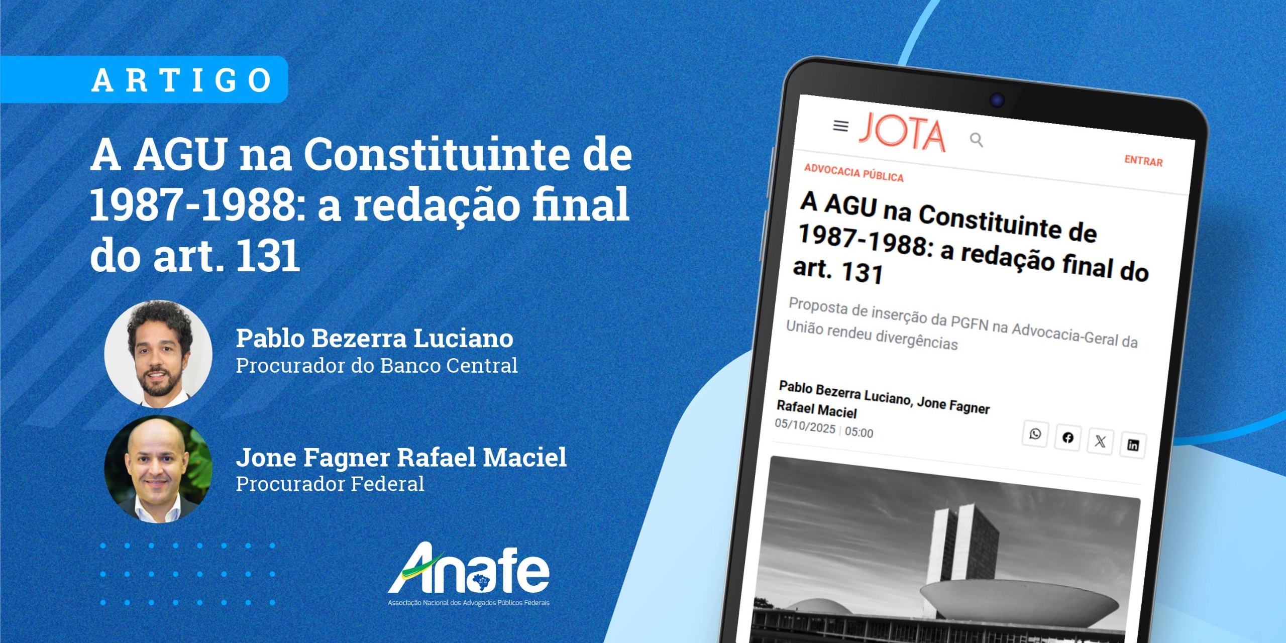 Em continuidade à série de artigos sobre a Advocacia Pública, foi publicado neste domingo (5) o quinto texto, “A AGU na Constituinte de 1987-1988: a redação final do art. 131”, assinado por Pablo Bezerra, Diretor de Comunicação Adjunto da ANAFE, e Jone Fagner Rafael Maciel, Representante Estadual da ANAFE no Rio Grande do Norte.