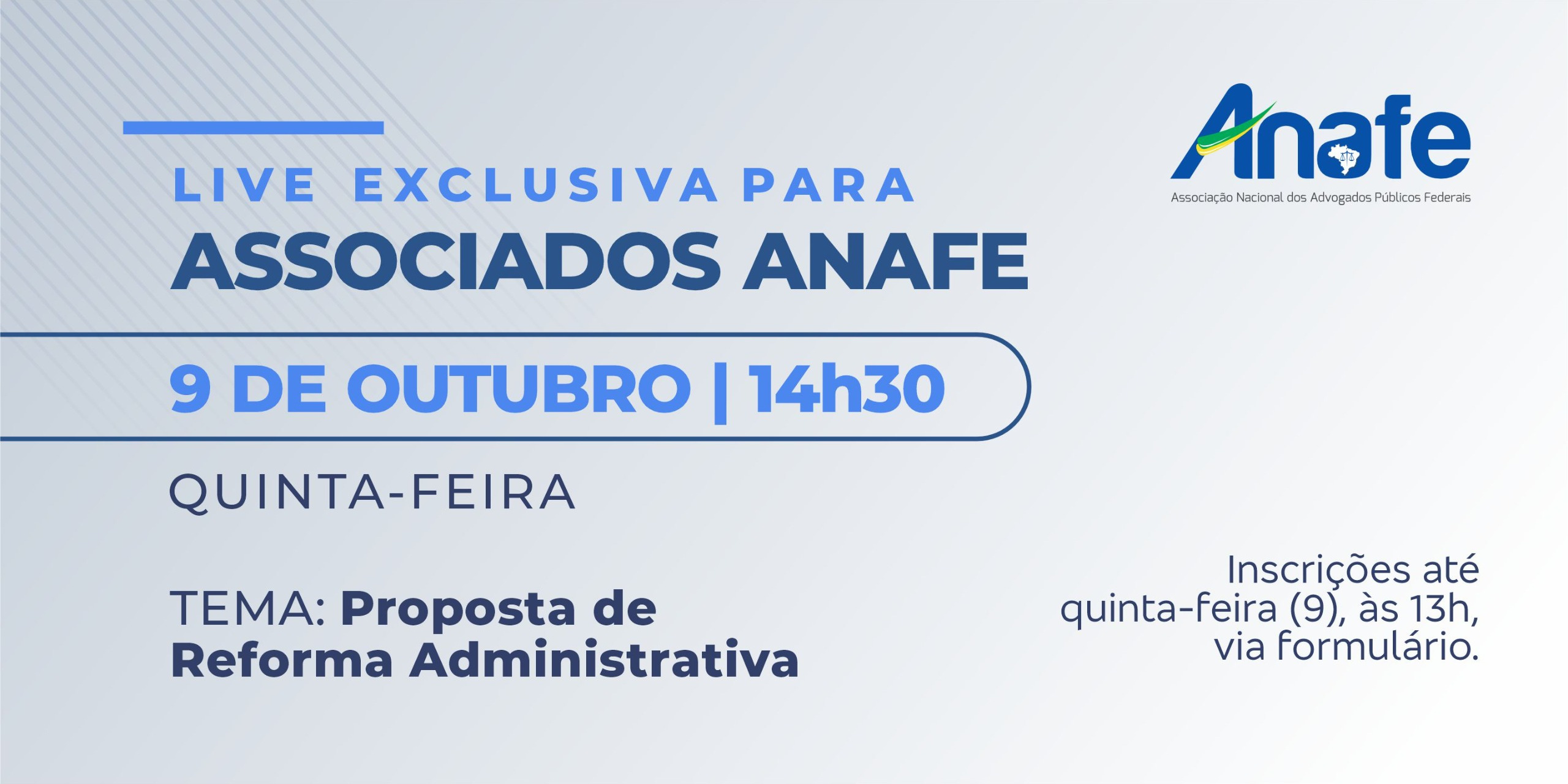 Na próxima quinta-feira, 9 de outubro, às 14h30, dirigentes da ANAFE promoverão uma live exclusiva para associados, com o tema “Proposta de Reforma Administrativa”.