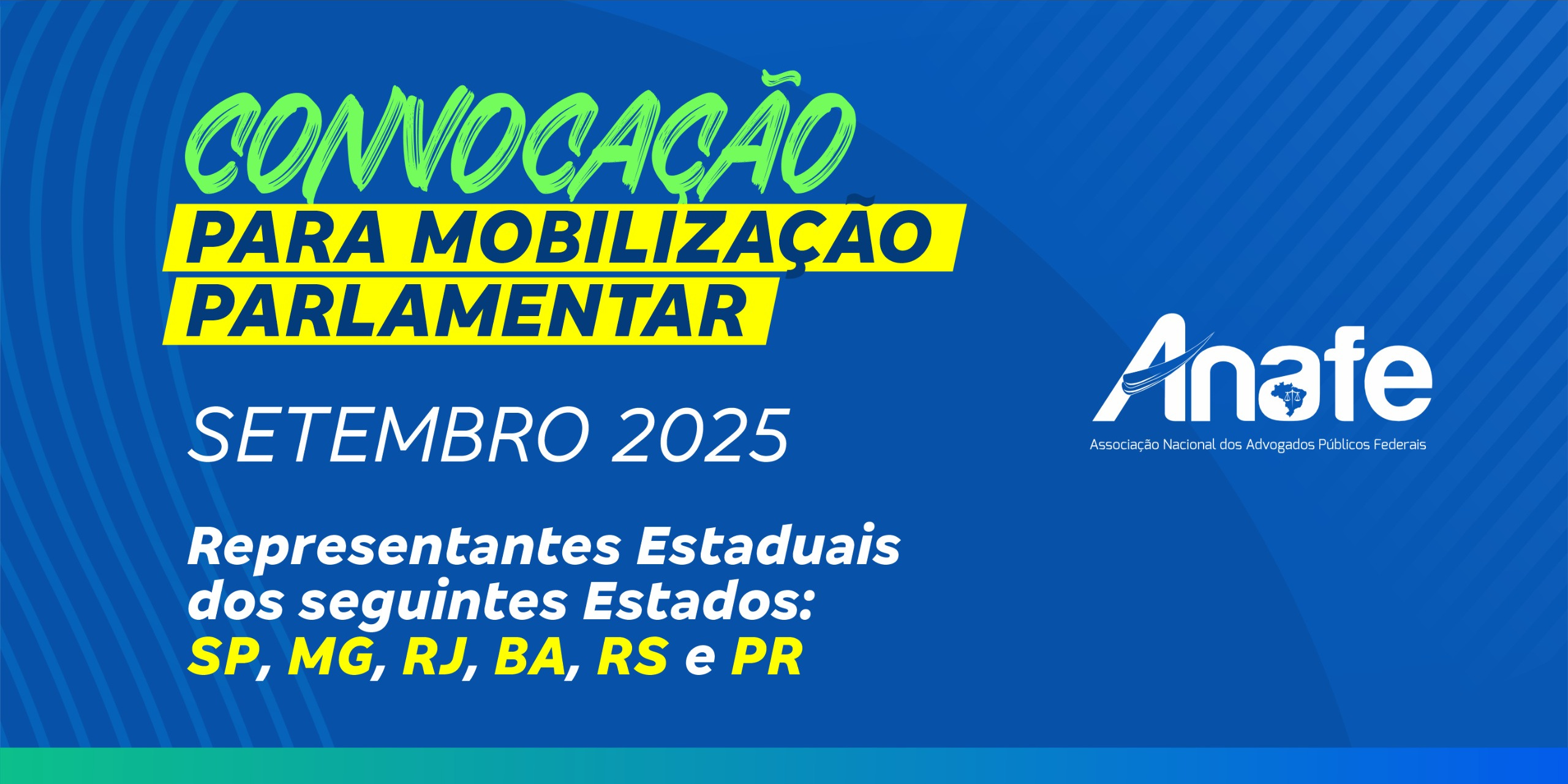 A Associação Nacional dos Advogados Públicos Federais (ANAFE) convoca os associados dos estados de São Paulo, Minas Gerais, Bahia, Rio Grande do Sul e Paraná para a mobilização parlamentar em Brasília, que ocorrerá entre os dias 15 e 18 de setembro.