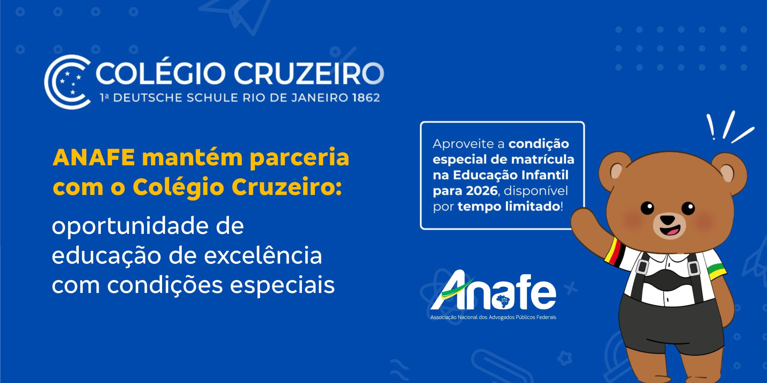 A ANAFE reforça sua parceria com o Colégio Cruzeiro, instituição de ensino com mais de 160 anos de tradição e referência em educação multicultural. Por meio do convênio, filhos de associados têm 5% de desconto nas mensalidades, benefício também estendido ao Retiro Humboldt, instituição voltada ao cuidado e à qualidade de vida de idosos.