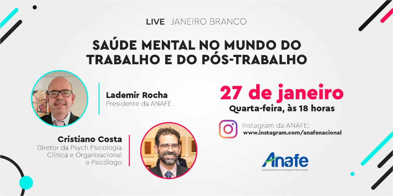 Para marcar o mês Janeiro Branco, dedicado à saúde mental, a ANAFE realizará, na próxima quarta-feira (27), às 18h, live na plataforma do Instagram sobre o tema “A Saúde Mental no mundo do trabalho e do pós-trabalho”, com Diretor da Psych Psicologia Clínica e Organizacional e Psicólogo, Cristiano Costa.