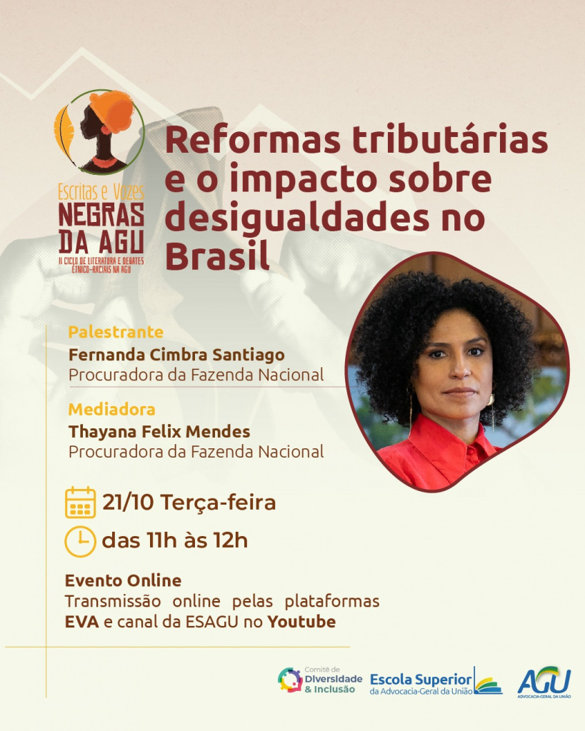 O evento será realizado online, no dia 21 de outubro (terça-feira), das 11h às 12h, com transmissão ao vivo pelo EVA da AGU e pelo YouTube.