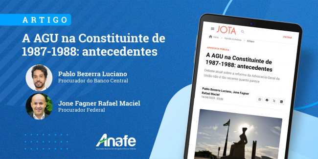 O JOTA publicou neste domingo (14) o artigo “A AGU na Constituinte de 1987-1988: antecedentes”, de Pablo Bezerra Luciano e Jone Maciel, dirigentes da ANAFE. O texto mostra que, antes de 1988, a Advocacia Pública Federal era fragmentada, com funções divididas entre o Ministério Público, a Procuradoria-Geral da Fazenda Nacional, a Consultoria-Geral da República e…