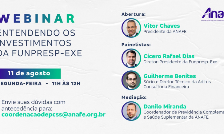 No próximo dia 11 de agosto, segunda-feira, a ANAFE realizará o webinar “Entendendo os investimentos…