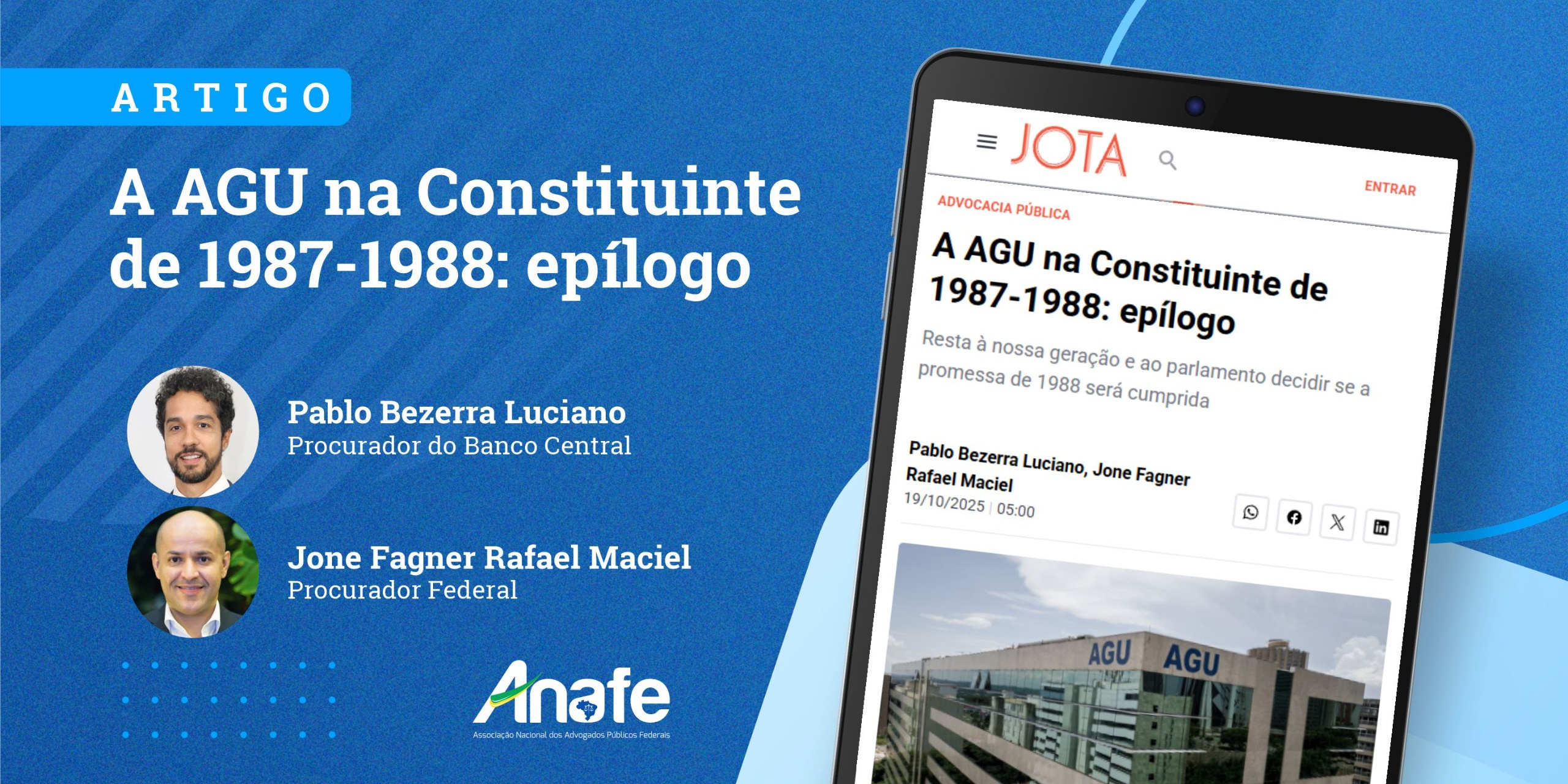 O portal JOTA publicou, neste sábado (19), o artigo “A AGU na Constituinte de 1987-1988: epílogo”, que encerra a série dedicada a reconstruir a gênese constitucional da Advocacia-Geral da União (AGU). O texto é assinado por Pablo Bezerra Luciano, Diretor de Comunicação Adjunto da ANAFE, e Jone Fagner Rafael Maciel, Representante Estadual da ANAFE no Rio Grande do Norte.